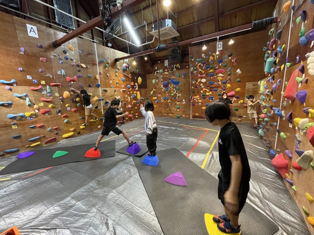 ボルダリングスクールでの各トレーニングメニューの実施時間は10-15分に設定し、子ども達が飽きないように内容を変え、メニュー自体もできる限りゲーム性を追求し、運動能力と非認知能力の向上を図ります。