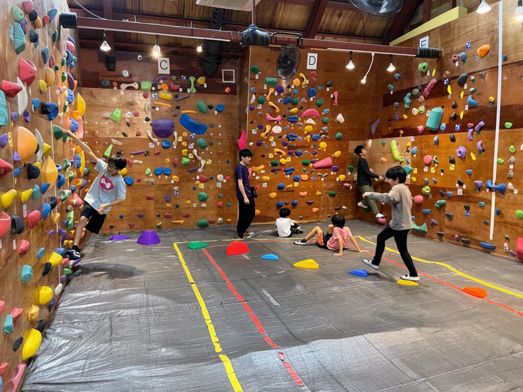ボルダリングスクールでの各トレーニングメニューの実施時間は10-15分に設定し、子ども達が飽きないように内容を変え、メニュー自体もできる限りゲーム性を追求し、運動能力と非認知能